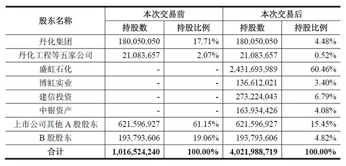 交易前,丹化科技實(shí)控人為江蘇省丹陽(yáng)市人民政府,持股比例19.79%,斯?fàn)柊铍`屬盛虹集團(tuán)。交易完成后,丹化科技將持有斯?fàn)柊?00%的股權(quán),公司控股股東將變更為盛虹集團(tuán),實(shí)控人將變?yōu)榭姖h根、朱紅梅夫婦。
