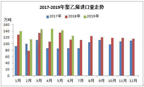 據(jù)統(tǒng)計(jì),2019年上半年P(guān)E進(jìn)口總量在813.1萬(wàn)噸,較去年同期(694.1萬(wàn)噸)增加119萬(wàn)噸,增幅在17.14%。2019年P(guān)E進(jìn)口量仍處于增加走勢(shì),主要原因是19年國(guó)外PE裝置擴(kuò)能更甚于國(guó)內(nèi),且國(guó)外PE輕烴裝置較多,聚乙烯成本較低,利潤(rùn)可觀,使得聚乙烯更具價(jià)格優(yōu)勢(shì)。