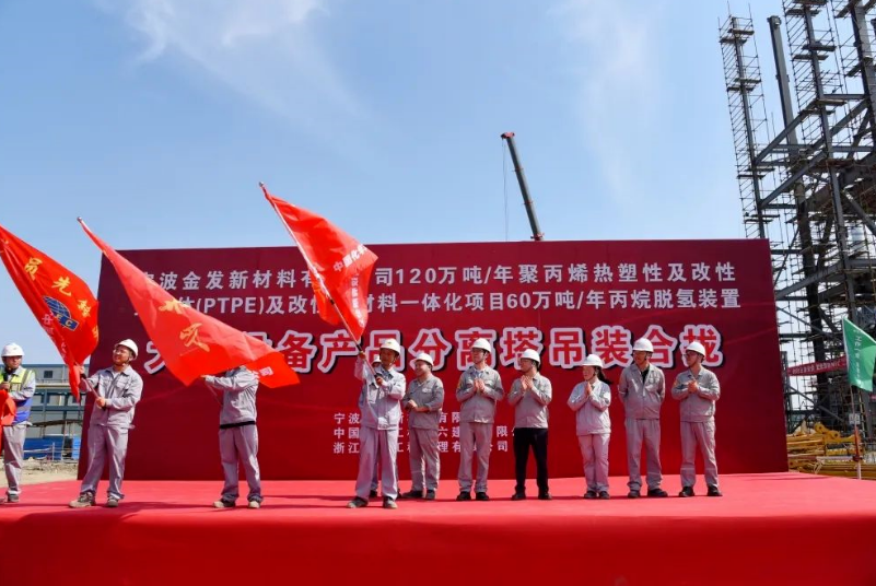 8月16日,一體化項目60萬噸/年PDH裝置大型設備產(chǎn)品分離塔第六段吊裝一次成功。