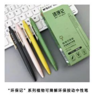 由秸稈、甘蔗渣、杉木粉等植物殘渣提取、發(fā)酵、聚合得到的聚乳酸,是一種具有可生物降解性能、生物相容性能的生態(tài)環(huán)保材料。晨光將其應用與 “環(huán)保記”系列植物可降解環(huán)保按動中性筆的筆桿。