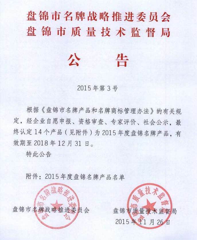 我公司產(chǎn)品——鶴福牌低煙無鹵阻燃聚烯烴護套料,通過盤錦市名牌戰(zhàn)略推進委員會、盤錦市質量技術監(jiān)督局評價審核,被認定為2015年度盤錦名牌產(chǎn)品!