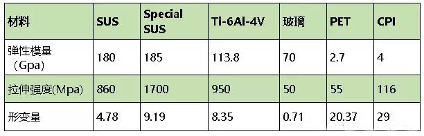 目前的屏幕基底材料以玻璃為主,但是玻璃不能彎曲折疊,因此塑料的特性成為折疊屏眼下最適宜的基底材料。熒幕基底換成薄膜后不僅基底能夠折疊,還可提高屏幕的抗摔性,同時(shí)屏幕更加輕薄。以下為列舉的幾種主要基底材料性能對(duì)比;